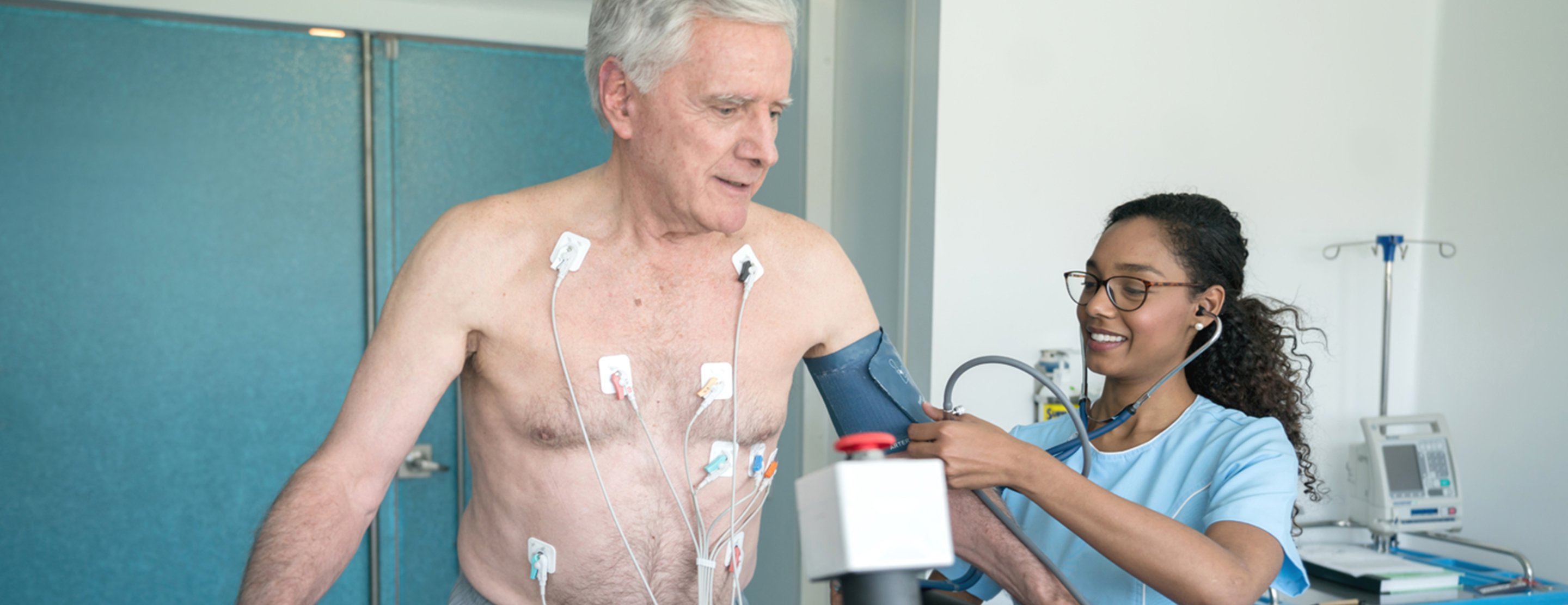 While you exercise, the activity of your heart is measured with an electrocardiogram (ECG). Your blood pressure readings are also taken.
